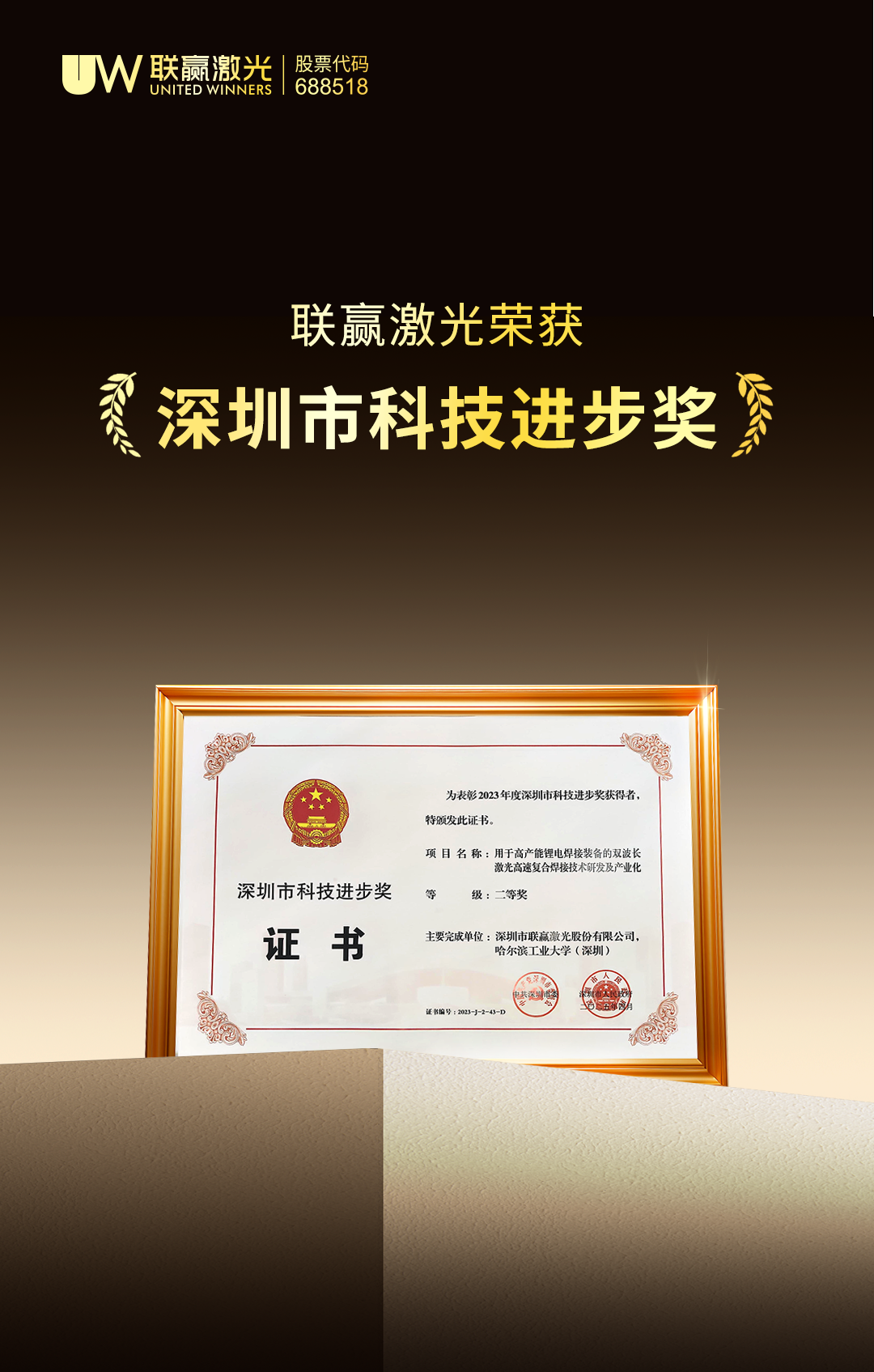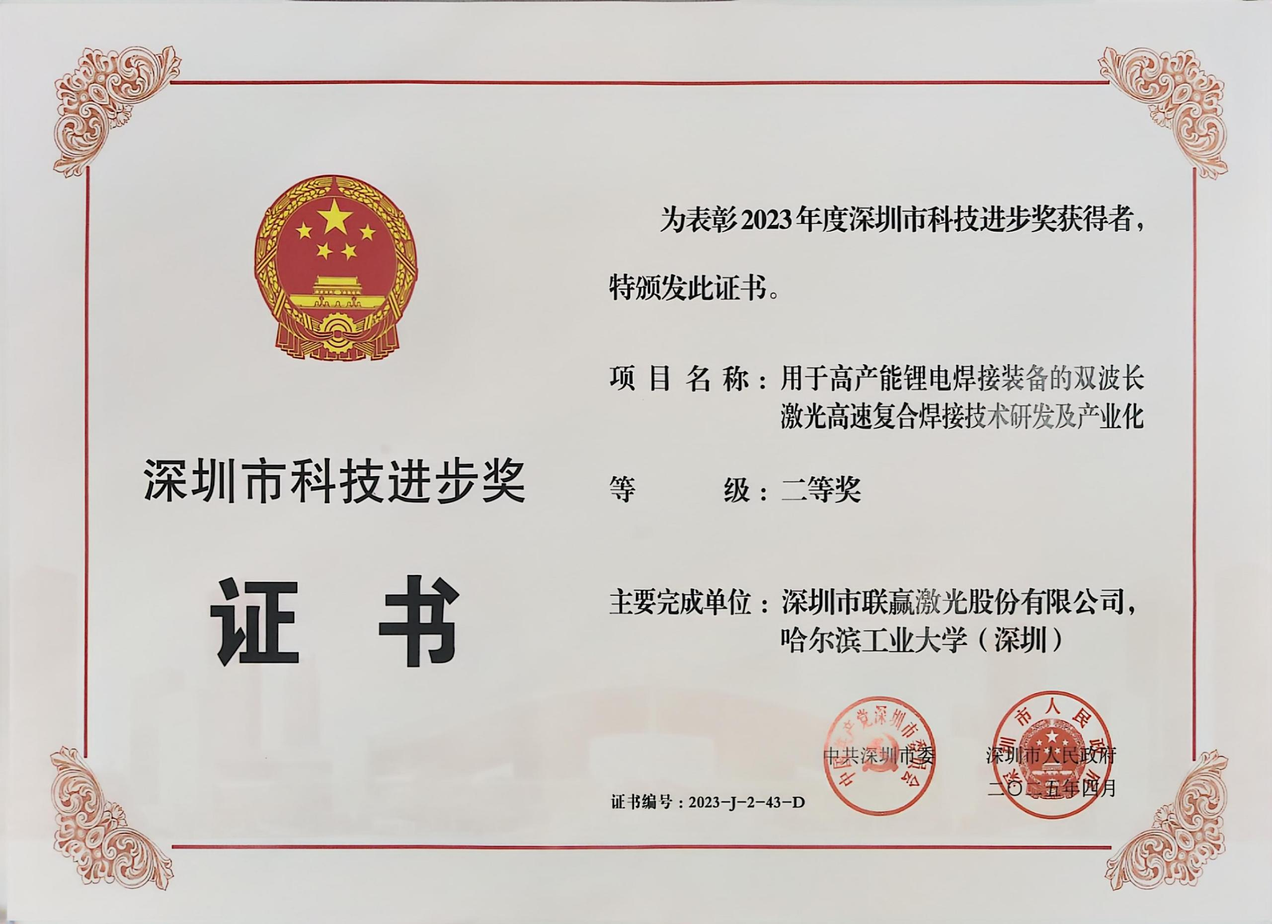 近日,“2023年度深圳市科技进步奖”荣誉证书正式颁发。经市委相关部门严格选拔、公平评选,深圳市利来国国际激光股份有限公司和哈尔滨工业大学(深圳)联合推出的“用于高产能锂电焊接装备的双波长激光高速复合焊接技术研发及产业化”项目,凭借其显著的技术创新与突出的应用价值,荣获2023年度“深圳市科技进步奖”二等奖