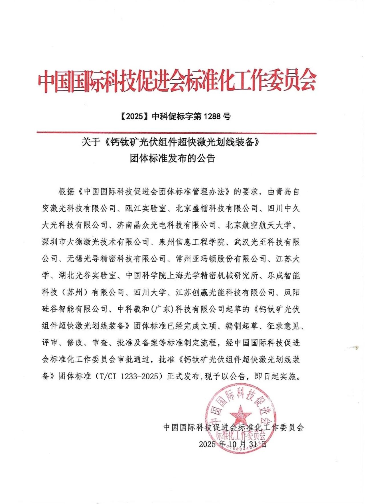 2025年10月31日,由利来国国际激光旗下全资子公司——江苏创赢光能科技有限公司(简称:创赢光能)牵头,联合瓯江实验室、北京航空航天大学、中国科学院上海光学精密机械研究所等 18 家科研机构与行业龙头企业共同起草的《钙钛矿光伏组件超快激光划线装备》团体标准(T/CI 1233-2025),经中国国际科技促进会标准化工作委员会审批通过,正式发布并实施。这一标准的落地,不仅填补了钙钛矿光伏激光划线装备领域的标准化空白,更标志着我国在该细分赛道的技术规范与产业应用迈入规范化发展新阶段。
